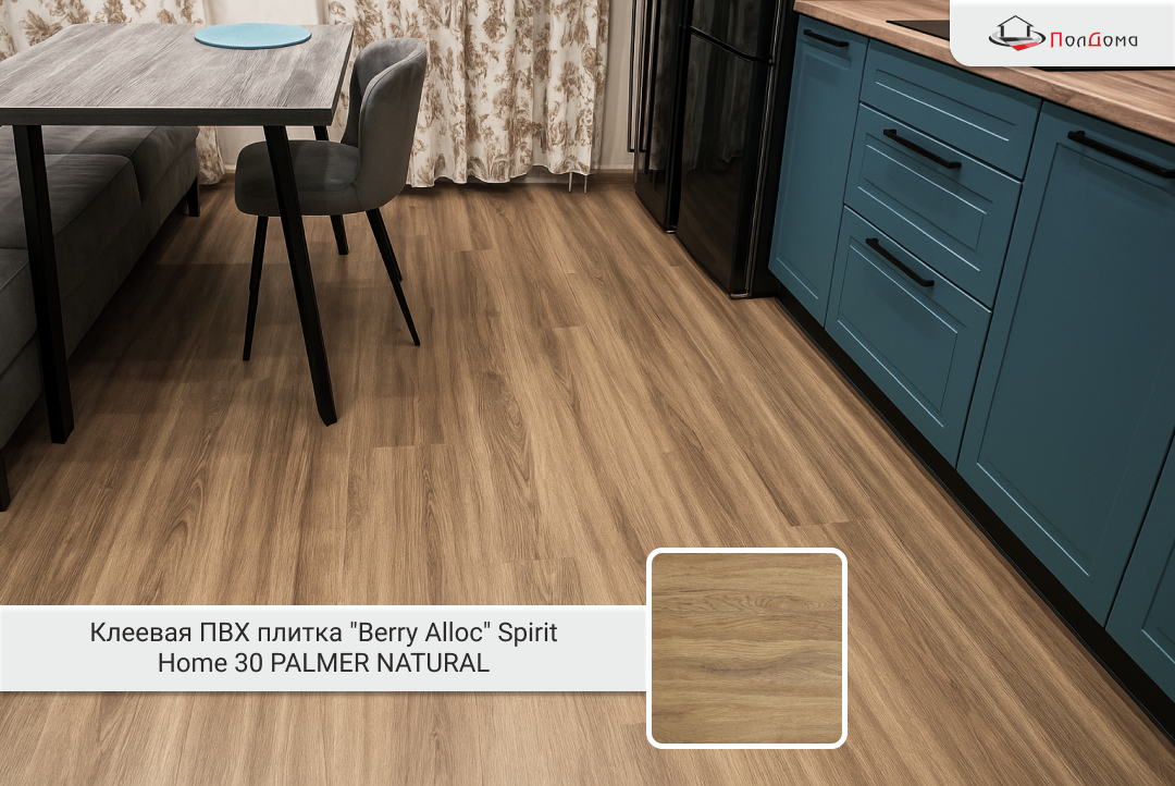 Ремонт прошёл быстро и без хлопот. За счёт грамотной подготовки основания и качественной укладки команда «ПолДома» обеспечила долговечный результат. Клеевая ПВХ-плитка Berry Alloc Spirit Home 30 Gluedown PALMER NATURAL стала отличным выбором для кухни — прочным, практичным и красивым покрытием, которое будет радовать владельцев долгие годы.